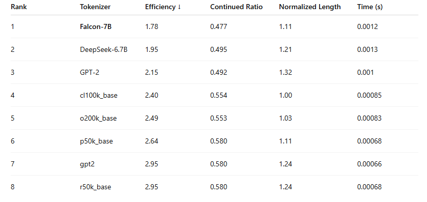 ⚠️ Least Efficient: GPT-2, gpt2, r50k_base still produce nearly double the token count of modern tokenizers. Even small prompts bloat quickly. High continued ratios and inflated normalized length across the board.